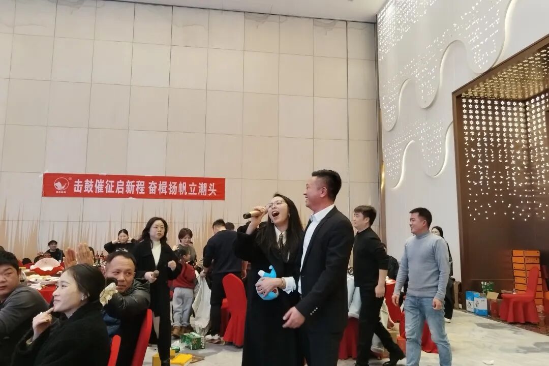 晚宴期间,还有美女员工献歌助兴,歌声悠扬,令人陶醉。何总热情洋溢地参与互动,员工们兴高采烈地摆pose,与美食、美景、奖品共同定格成美好的记忆。